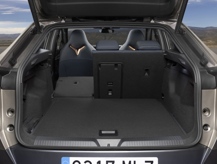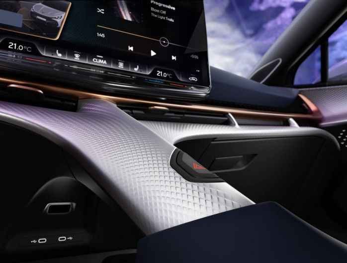 Het exterieurdesign van de CUPRA Tavascan kenmerkt zich door atletische en sportieve dimensies. Vooraan is de ledmatrixverlichting met de driehoek-signatuur onmiddellijk herkenbaar. Het interieur is een sterk staaltje van architectuur dankzij de karakteristieke centrale ruggengraat samen met de fijne luchtroosters, die bijna onzichtbaar zijn.